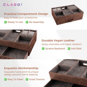 This high-quality organiser is made of Pu leather with dramatic stitched edges, bringing both function and style to your room! Four small sections hold anything from watches, cards, rings, wallet, band, pens and pencils to mobile phones. Ideal for desk and wardrobe organiser say goodbye to your mess desk, the best choice for a home office, provide you with a tidy environment. Discover the many uses of this elegant organiser. ”