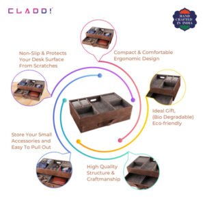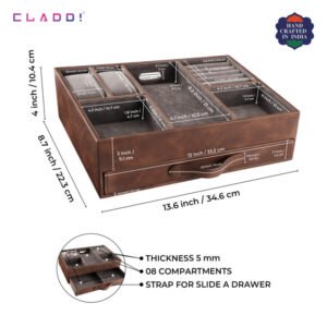 Do you have important stuff to organise? And are you looking for the perfect organiser to place next to the bed, dressing table, makeup room, home, and office? Then, here is the perfect one which is CLADD! Organiser With Drawer. This organiser comes with a dedicated slot for keeping rings and treasures, a slot for keeping watches, a drawer with a partition, three compartments to keep tie, sunglasses, and other valuables, and a charging hole.