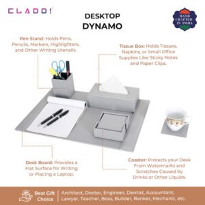 Keep all your favourite stationeries and essential office supplies in one place with this Vegan leather office desk organiser. It comes with a Pen Stand, Coaster Set, Anti-skid Mat, and a Tissue Paper Holder.