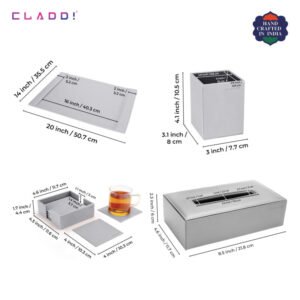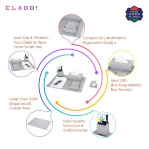 One of the most important ways to stay productive is to stay organised. CLADD’s Office desk organiser set is an efficient way of keeping the office organised. Our office desk organiser can hold more than pens and pencils. Keep all your favourite stationeries and essential office supplies in one place with this faux leather office desk organiser. This super compact and classic organiser will give that much-needed zing to your work station. The pen stand fits in pens, pencils, staplers, scissors, rulers, glue sticks, binder clips, sticky notes, postage stamps, and all the other odds and ends that find their way onto surfaces large and small.