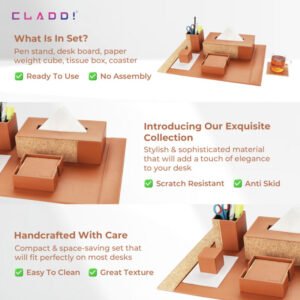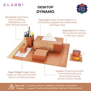 Keep all your favourite stationeries and essential office supplies in one place with this faux leather office desk organiser. It comes with a Pen Stand, Coaster Set, Paperweight, Anti-skid Mat, and a Tissue Paper Holder. ”