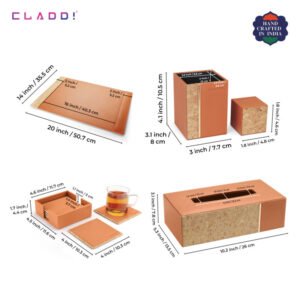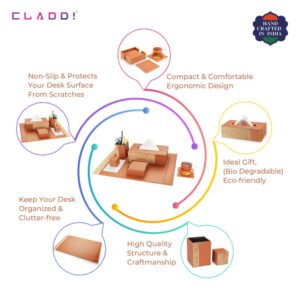 One of the most important ways to stay productive is to stay organised. CLADD’s Office desk organiser set is an efficient way of keeping the office organised. Our office desk organiser can hold more than pens and pencils. Keep all your favourite stationeries and essential office supplies in one place with this faux leather office desk organiser. This super compact and classic organiser will give that much-needed zing to your work station. The pen stand fits in pens, pencils, staplers, scissors, rulers, glue sticks, binder clips, sticky notes, postage stamps, and all the other odds and ends that find their way onto surfaces large and small.