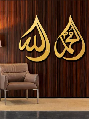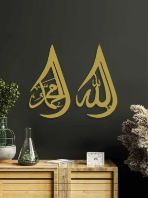 Elegant Allah (SWT) and Mohammad (PBUH) Metal Wall Art set in sleek Gold, perfect for Islamic home decor. This set of two pieces features intricate calligraphy, ideal for enhancing your space. A meaningful addition for Ramadan, Eid, or Muslim gifts, blending faith and artistry in timeless design.