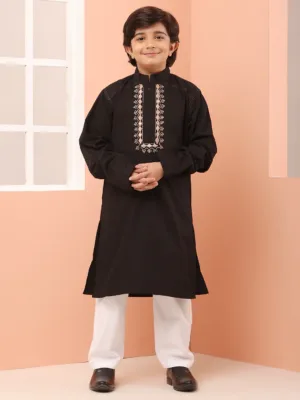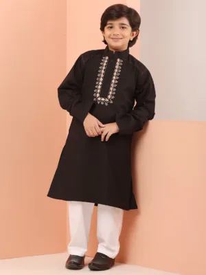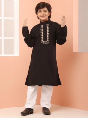 This boy’s black embroidered kurta and white pajama set brings together elegance and comfort in a stylish design. Crafted from soft cotton, the kurta features a refined mandarin collar, zip closure, and functional side pockets, adding convenience to its simplicity. Paired with an elasticated slip-on pajama, this outfit is perfect for both formal and relaxed occasions.