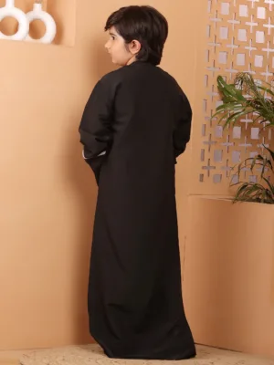 Black Solid Round Neck Piping Detailing Thobe / Jubba For Kids Boys