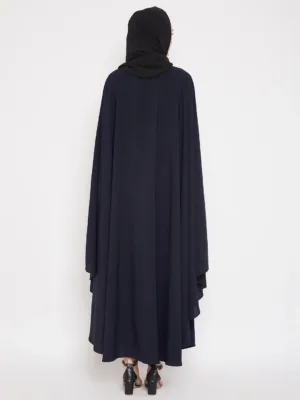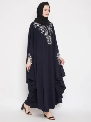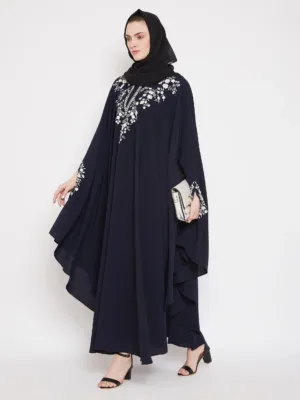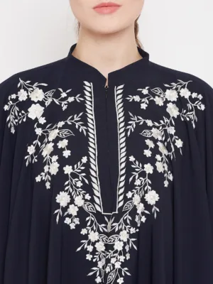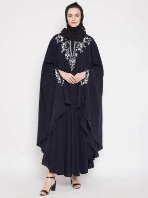 Blue Chikan Hand Embroidered Irani Kaftan Abaya with Black Georgette Hijab