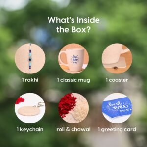 This beautifully curated eco friendly rakhi gift hamper for brother includes 1 rakhi set of evil eye rakhi, printed rice husk mugs, coaster, key chain, card, roli and chawal. They make a perfect Rakhi gift, combining love and care for nature.