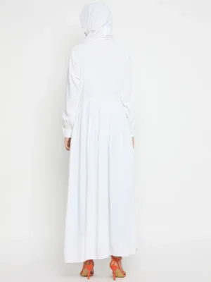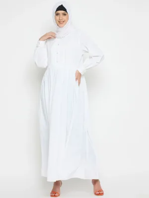 Elevate your modest wardrobe with our solid white Embroidery Design Abaya, designed specifically for Umrah or Hajj. Tailored for Islamic women seeking timeless elegance, it features cuffed sleeves, a round neck, and four front buttons closure. This comfortable piece promises durability and style for everyday wear, embodying both grace and practicality for the discerning wearer.