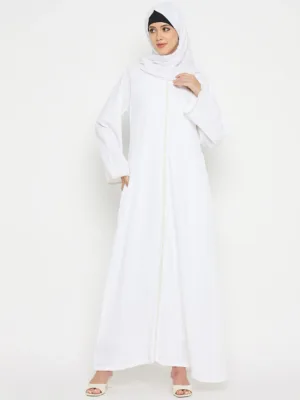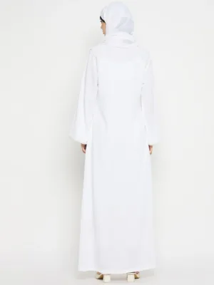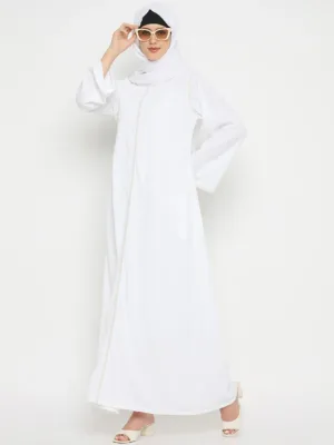 Indulge in timeless sophistication with our embroidered white solid abaya is perfect for wearing during Umrah or Hajj, meticulously tailored from cy crush fabric for Islamic women seeking modesty and comfort. Its round neck and long, free sleeves offer everyday versatility, while intricate embroidery adds a touch of elegance, making it a wardrobe staple for any occasion.