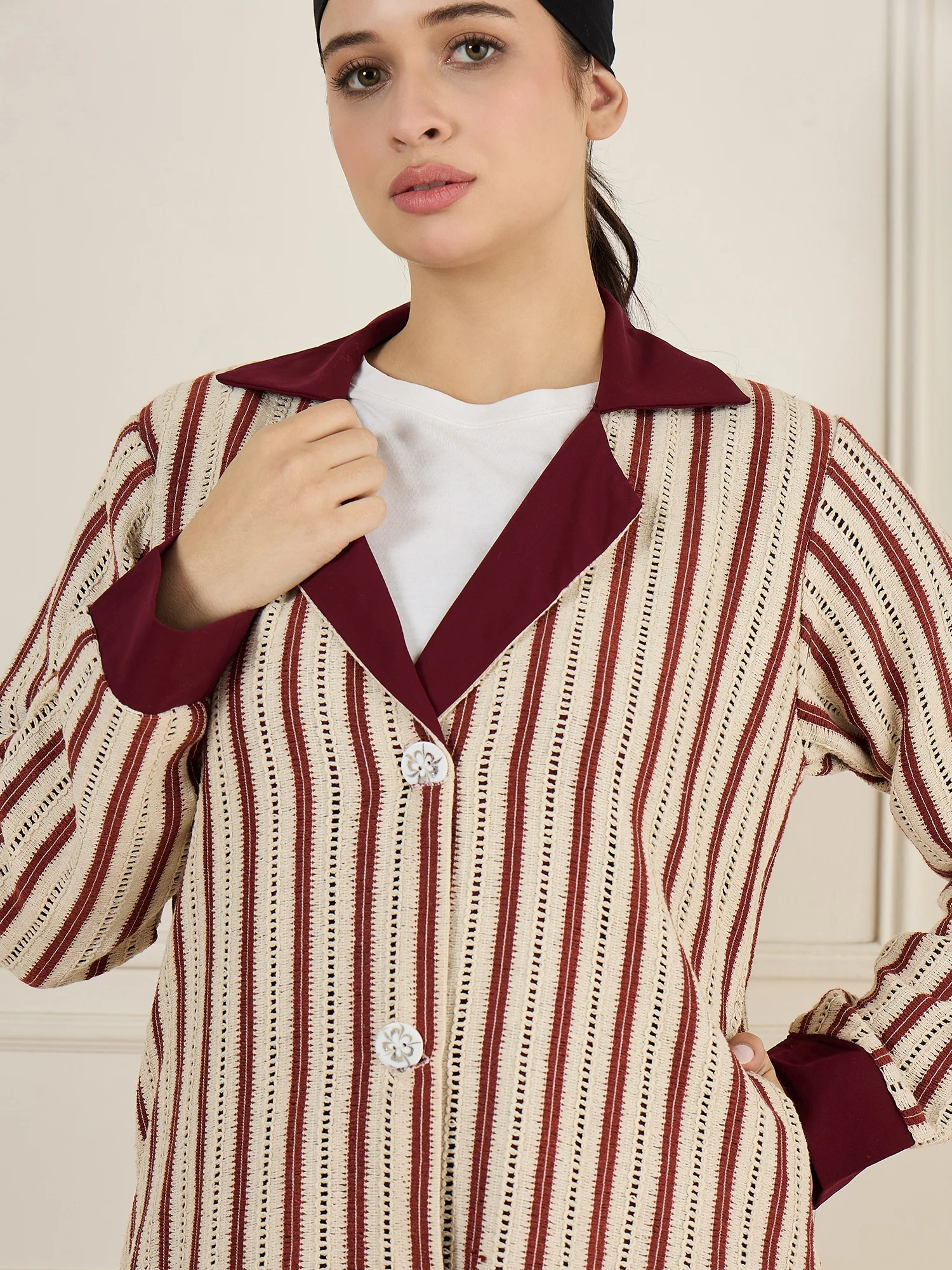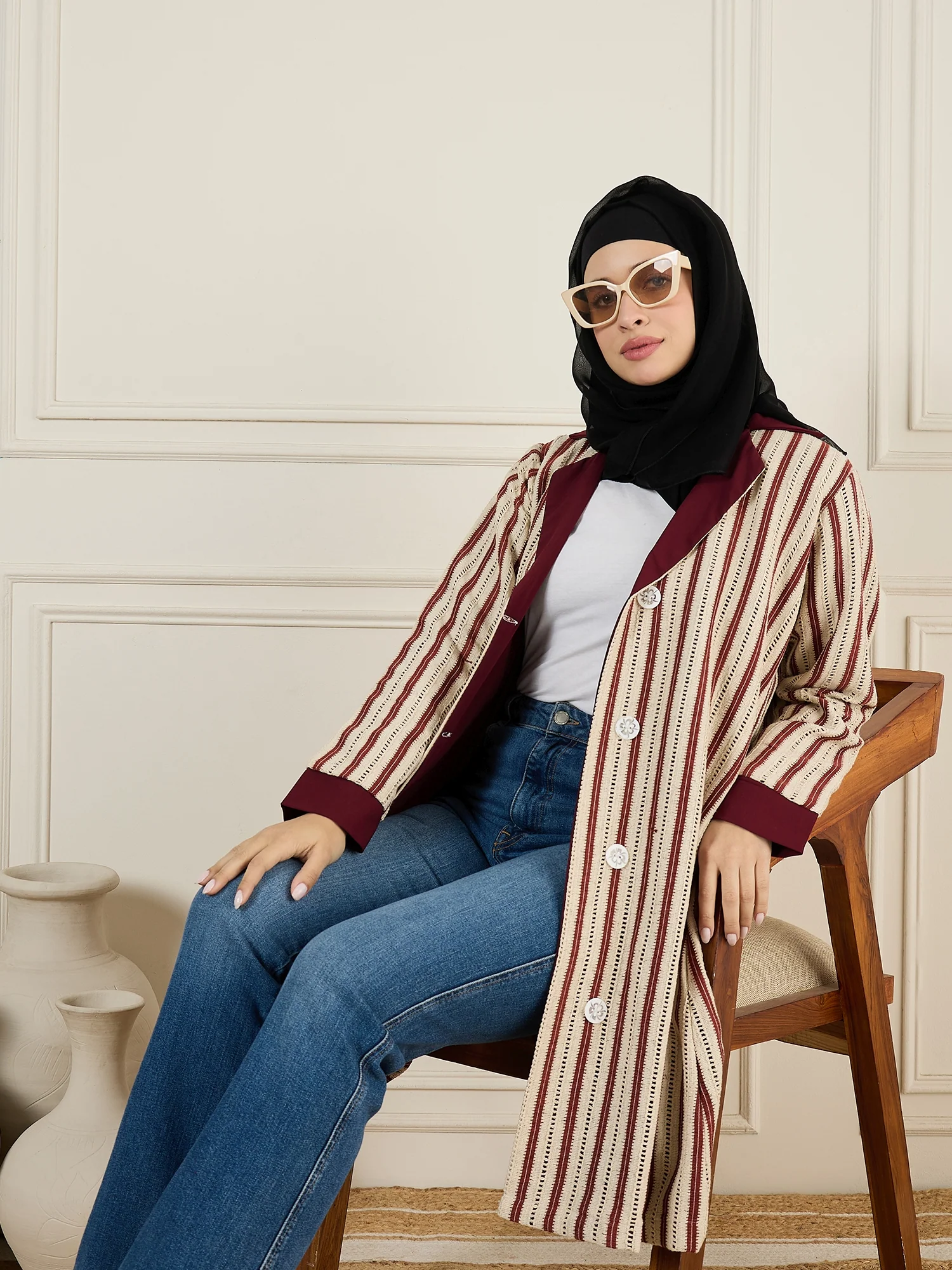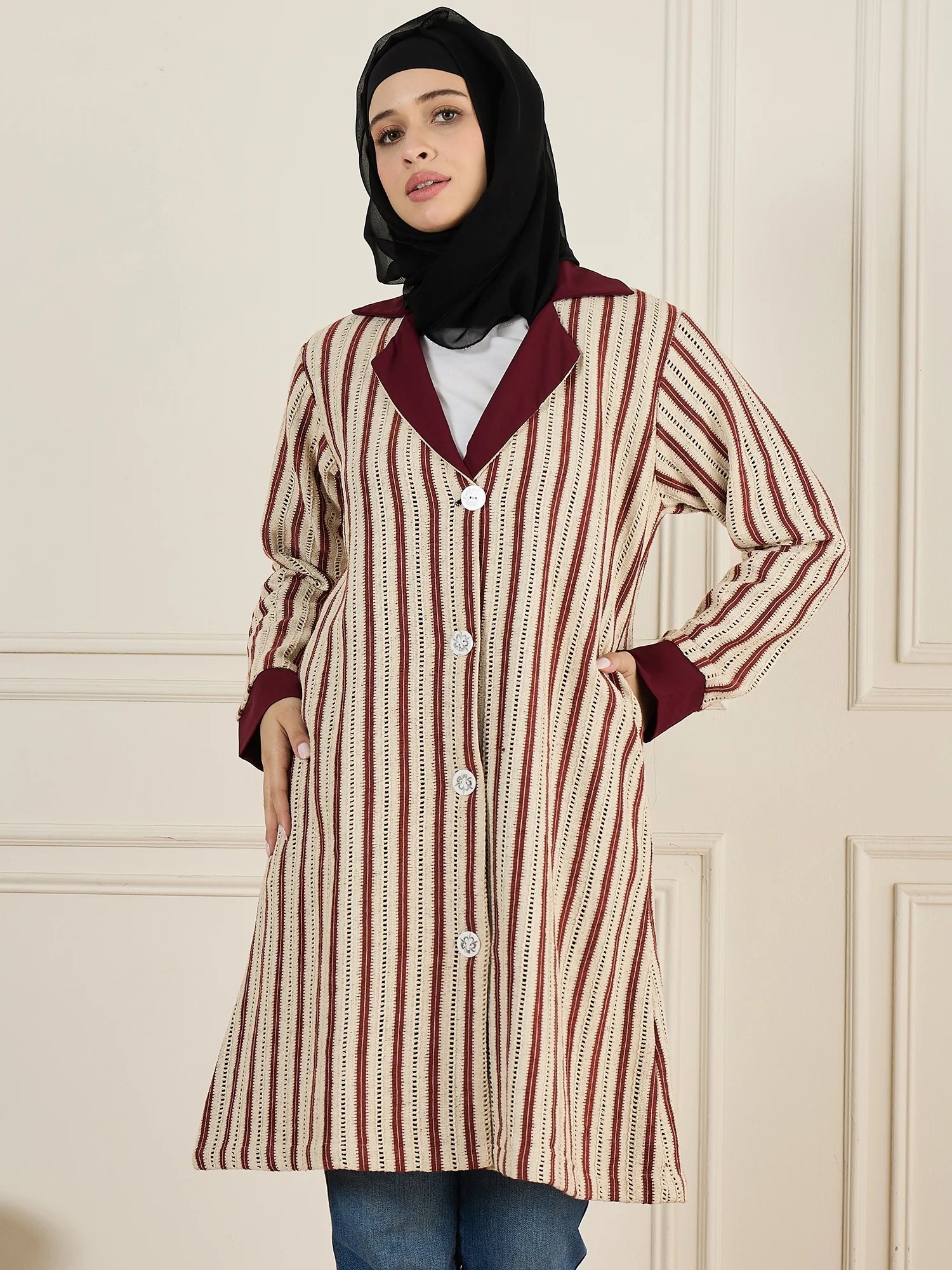 This knitted outerwear jacket for women, crafted from breathable cotton, boasts a classic collar with a chic maroon accent. Designed with practical side pockets and a front-open button closure, it combines elegance and functionality effortlessly. Perfect for any occasion, this versatile piece enhances both casual outings and formal events, adding a vibrant and sophisticated touch to your wardrobe.