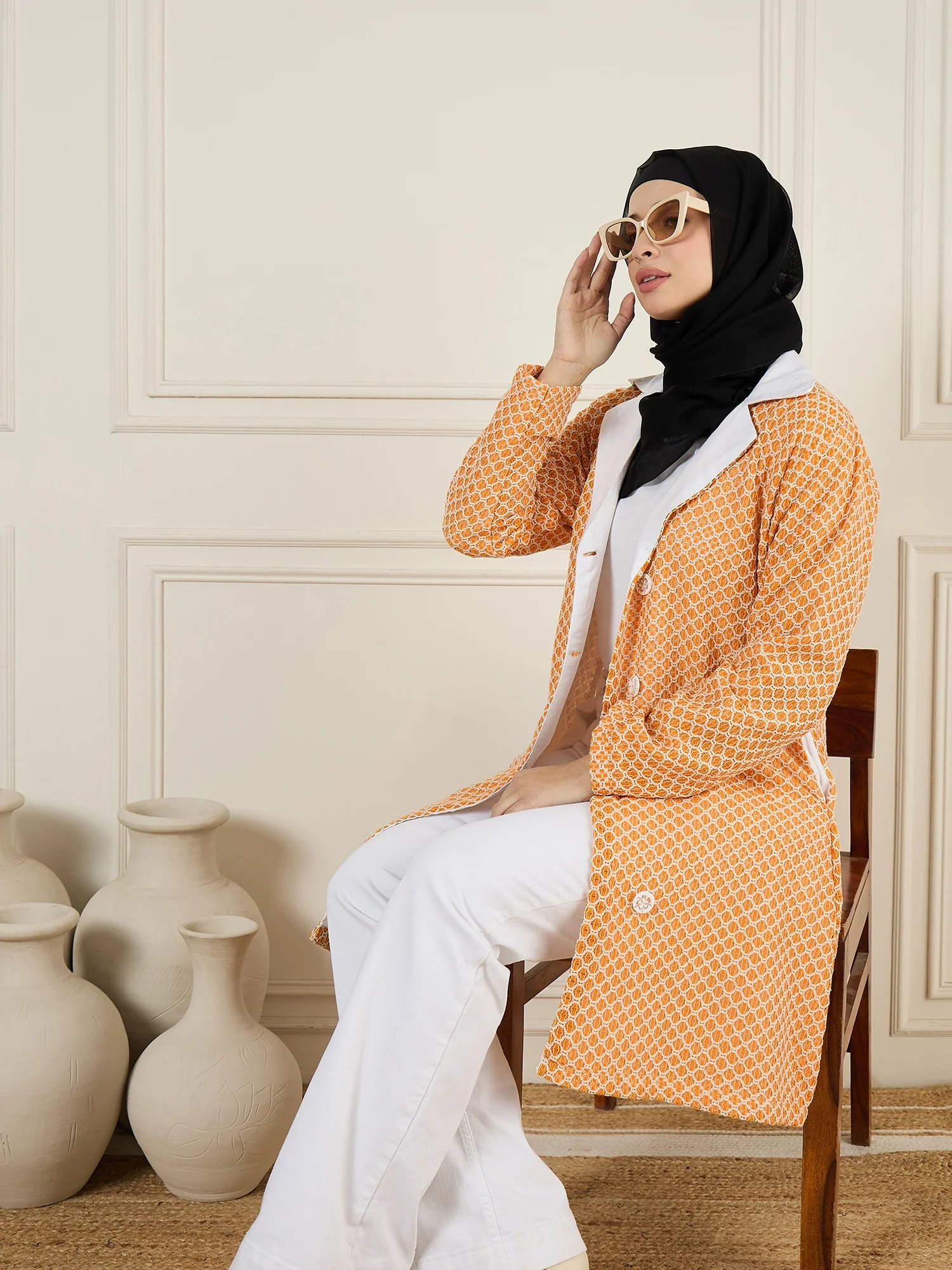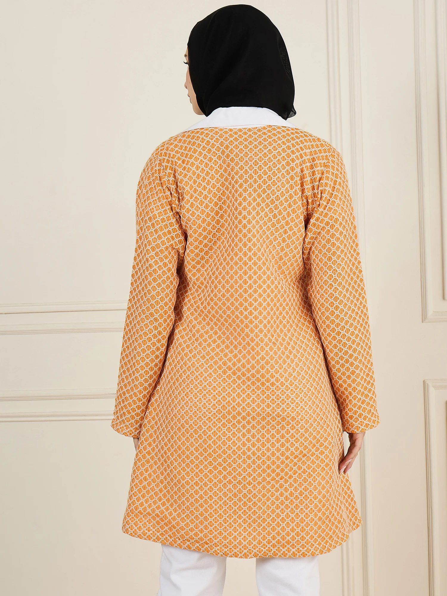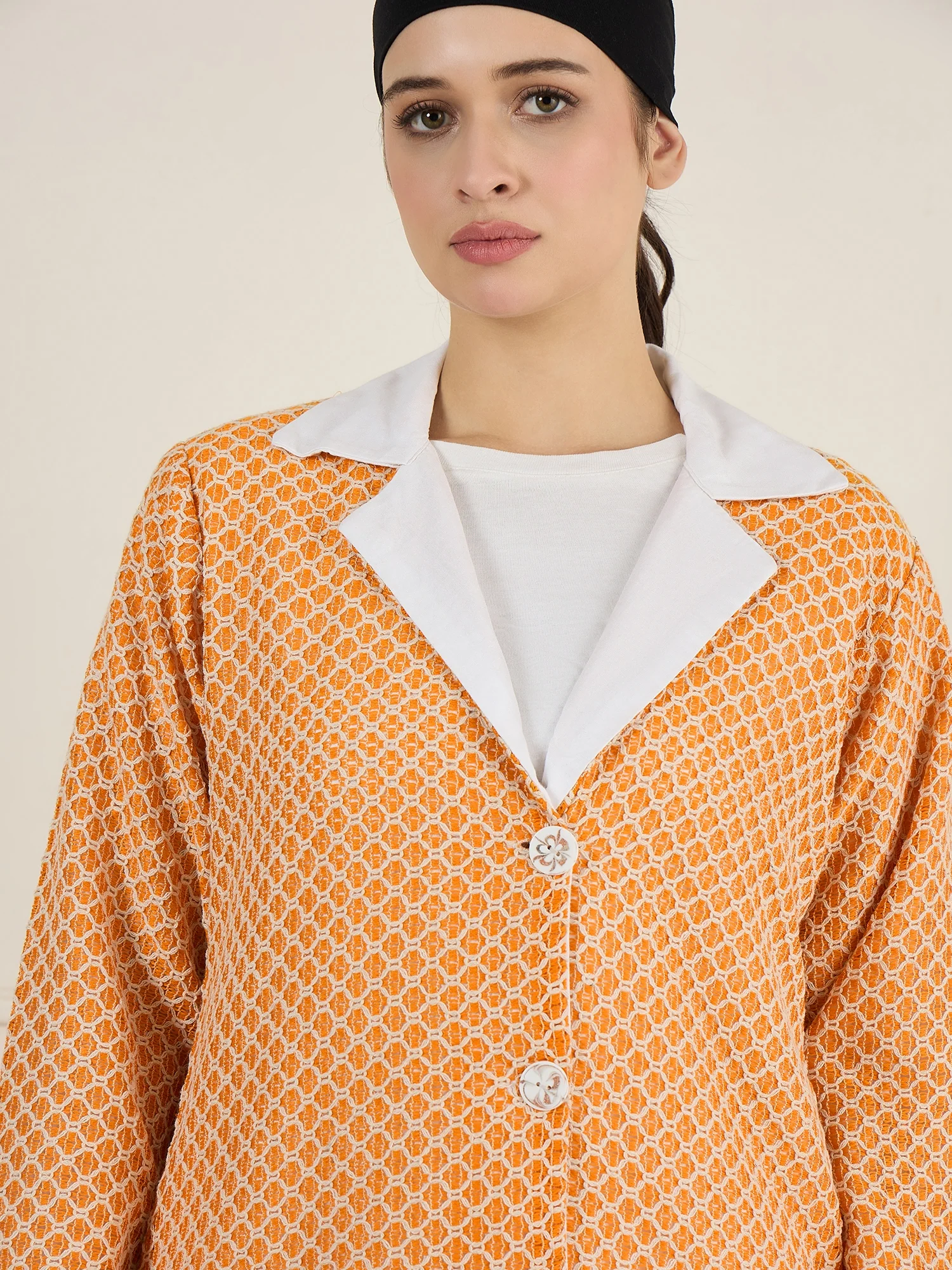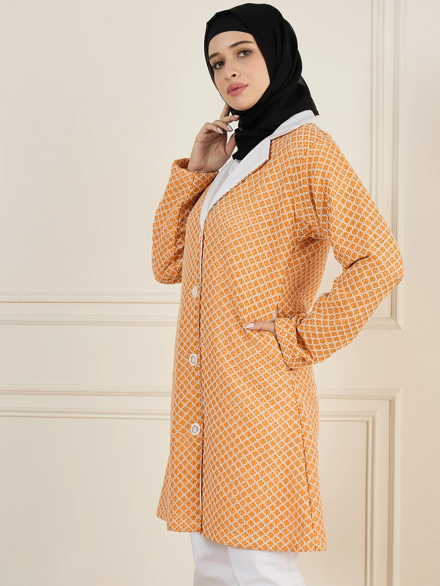 This orange knitted outerwear jacket for women, crafted from breathable cotton, boasts a classic collar with a chic white accent. Designed with practical side pockets and a front-open button closure, it combines elegance and functionality effortlessly. Perfect for any occasion, this versatile piece enhances both casual outings and formal events, adding a vibrant and sophisticated touch to your wardrobe.
