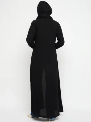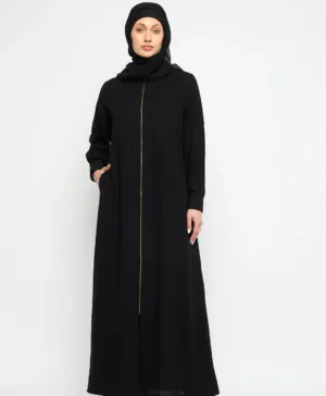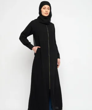 Indulge in femininity with the Black Abaya Dress. Featuring a front open, zip closure, mandarin collar, and cuffed sleeves, this solid nida matte fabric abaya combines comfort and style. Ideal for all seasons, it effortlessly embodies modesty, offering Islamic women a chic and comfortable fashion choice.