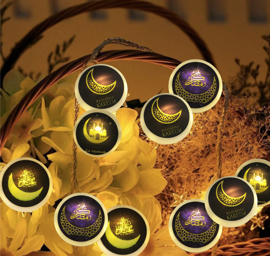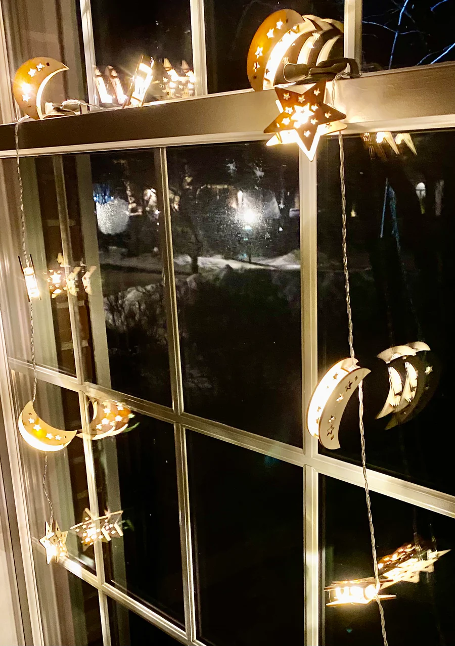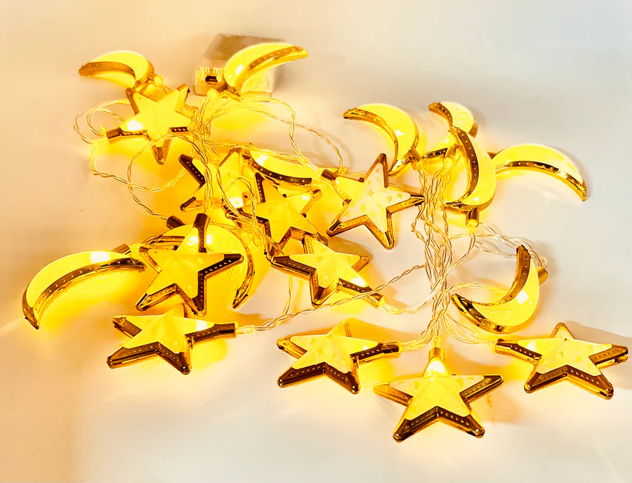 Moon and Star String Lights for Festivities. String lights with Low powered LED bulbs Warm White. Lasts longer. LED light are widely used in household and building decoration, classic style with a unique effect gives it distinctive characteristics. These lights are Holiday themed to especially suit Eid Party/ Iftar Party background layout, guesthouses, hotels, parties, households, shop windows and other places. As long as you want, they can bring you a noble luxurious, aesthetic, and warm atmosphere. Color: Clear Light Type: Decorative Festive Lights Are batteries needed to power the product or is this product a battery: No Is this a Dangerous Good or a Hazardous Material, Substance, or Waste that is regulated for transportation, storage, and/or disposal? : No This product does not contain batteries. However, you can easily purchase batteries at your nearest hardware store We want you to be completely satisfied with your purchase. Please contact us for any issues related to these lights. We are here to help! Happy Holidays!