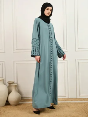 The sea green Palestine abaya epitomizes modest fashion and fusing comfort with cultural grace flawlessly. Crafted for Islamic women who value both style and tradition, it serves as a symbol of cultural pride and refined elegance. This meticulously designed garment transcends mere clothing, embodying a blend of tradition and contemporary sophistication.
