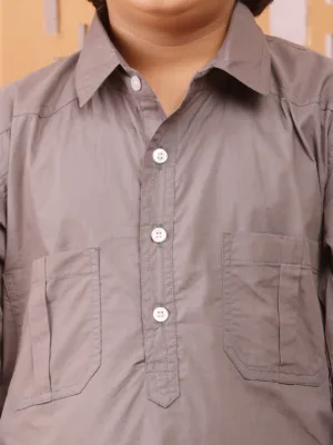 This stylish Pathani kurta pajama set for Muslim boys offers a modern yet modest look. Crafted in a solid grey shade, it features a classic shirt collar for a sharp finish. Made from comfortable fabric, it ensures ease of movement, perfect for daily wear and special occasions. The latest design blends tradition with contemporary fashion, making it a must-have.