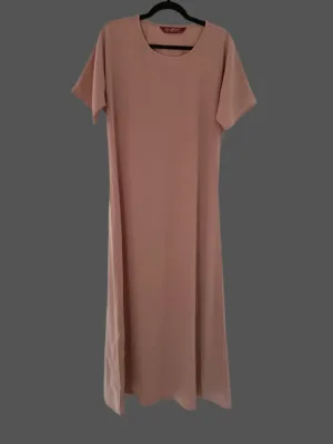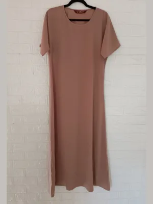 Enhance your look with our beige half-sleeve inner layering slip in solid Nida Matte fabric. Its full-length design adds effortless elegance, pairing beautifully with trench coats, jackets, kimonos, and open abayas. Offering versatile style and timeless coverage, this slip is a perfect layering essential for any occasion.