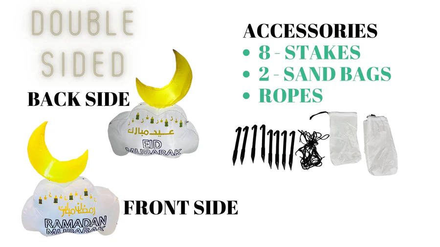 Illuminate your Ramadan this year with the beautiful inflatable décor perfect for a Ramadan welcoming. You can light up your backyard with this décor piece. The product can be a great addition for your Ramadan iftar party décor especially if the iftar party is for the kids, the décor will match the Ramadan vibe and you can use it as a photo booth for Ramadan memories year 2024 and so on. You can decorate your space with this inflatable Ramadan welcoming décor that comes with LED lights it is easy to inflate and deflate for your iftar parties, Ramadan get-togethers, Eid parties, kids iftar party etc. You can even pass this on as a gift among your friends and family on the arrival of Ramadan. It is dual sided and can be used for both Ramadan and Eid.