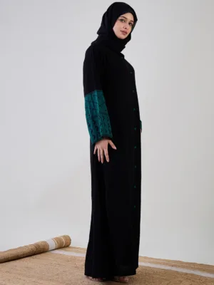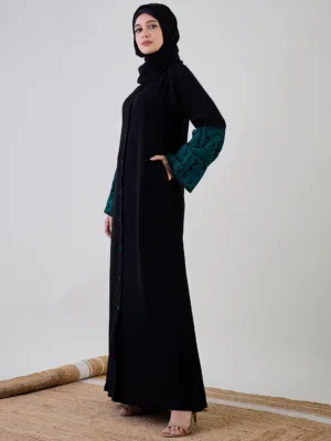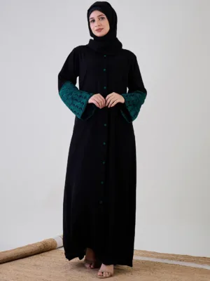 This kefiyyeh embroidered black front-open abaya burqa, crafted from premium soft Nida Matte fabric, is a symbol of modern modest fashion. Featuring elegant bell sleeves with bottle green embroidery, practical side pockets, and intricate detailing, it blends timeless style with functionality. Perfect for any occasion, this abaya offers a sophisticated and contemporary appeal for Muslim women.