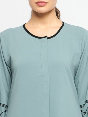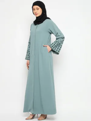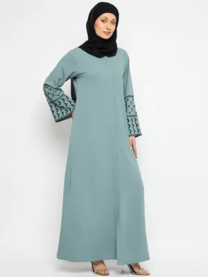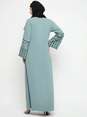 Elevate your modest wardrobe with this front-open sea green Kefiyyeh Abaya adorned with black embroidery. Crafted from comfortable cy crush fabric, featuring free sleeves, side pockets, and a modest design, it is tailored for Islamic women seeking both style and ease.