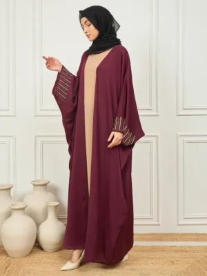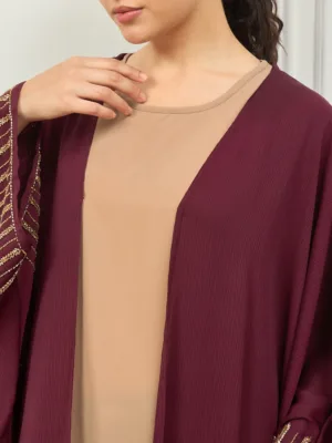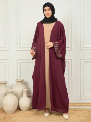 Elevate your modest wardrobe with this maroon and beige luxury abaya burqa, tailored from premium Prada fabric. The flowing maroon upper layer gracefully overlays the beige inner layer, creating a stunning layered effect. Intricate handwork on the sleeves adds an elegant touch, while the round neck, relaxed fit, and slip-on style ensure all-day comfort. Designed for Islamic women, this abaya beautifully fuses traditional modesty with modern sophistication—making it an ideal choice for festive events and special occasions.
