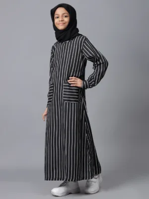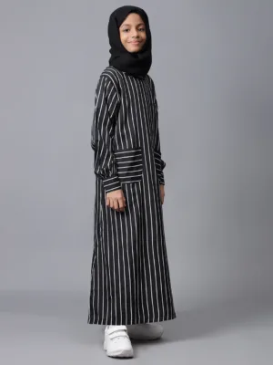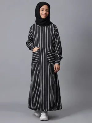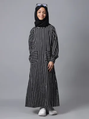 This black striped abaya for Muslim and Islamic girls combines modesty with style. Featuring cuffed sleeves and two convenient patch pockets, it offers a chic, modern look that’s perfect for everyday wear. Designed to be both modest and attractive, this abaya ensures your little one stays on-trend while feeling comfortable and confident.