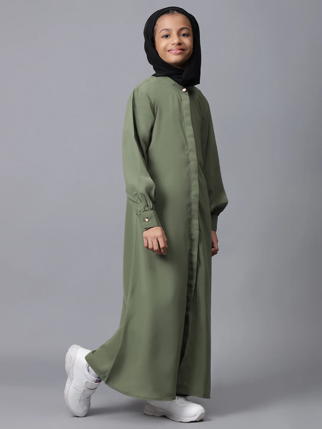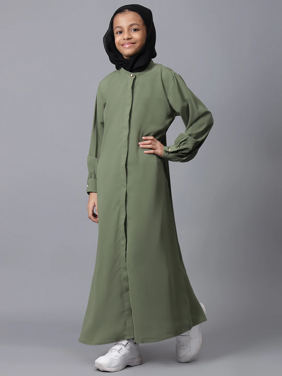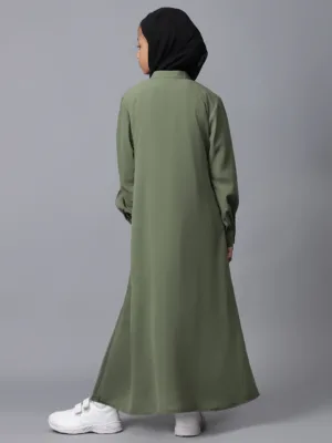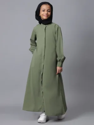 Elevate your little one’s modest fashion with this front open jade green abaya, designed for Muslim and Islamic girls. Featuring cuffed sleeves and a solid, elegant look, this abaya offers both comfort and style. Perfect for the latest trends, it ensures an attractive appearance, blending tradition with a contemporary touch, ideal for any occasion.