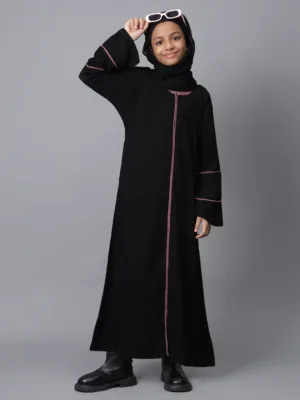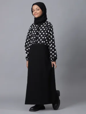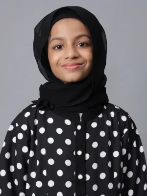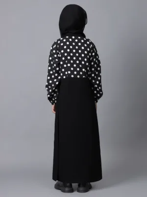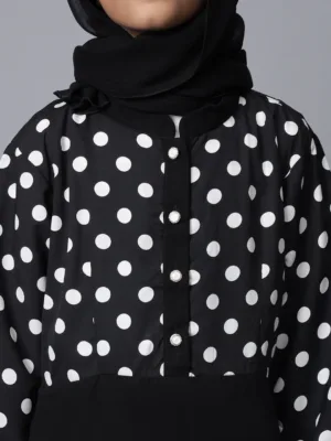 This black-and-white polka dot top-skirt-style Abaya dress for Muslim girls blends modesty and charm. Featuring puffed sleeves, it’s crafted with soft crepe on the upper side and Nida Matte on the lower side for comfort and durability. The latest design ensures an attractive look, making it perfect for long-lasting wear while keeping your child stylish and modest.