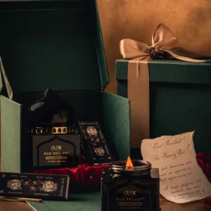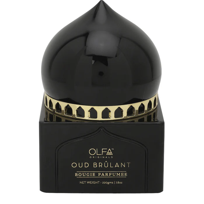 A bougie parfumée with decadent cedar wood, a mesmerizing grip of animalic suede, and dazzling Musk, a signature of Olfa Originals. The dark-brown resin, known as agarwood, or Oud infused in soy wax, comes with a hand-calligraphed scroll and matchbox.