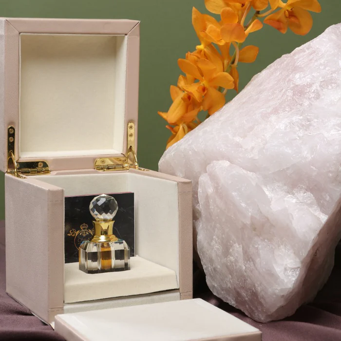 This mystic essence is poured in a classic clear-cut crystal bottle, placed ever-so elegantly in the niche of a luxurious leather box!