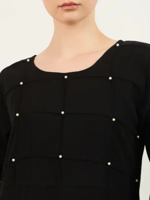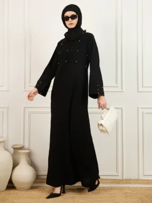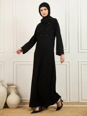 Add a touch of elegance to your modest wear with this black abaya burqa, featuring delicate pearl detailing on the front and sleeves. Crafted from soft Nida matte fabric, it offers a round neck, graceful bell sleeves, and a comfortable slip-on closure. Perfect for any occasion, this solid abaya combines sophistication with contemporary modest fashion—making it an ideal choice for Muslim women who value both style and tradition.
