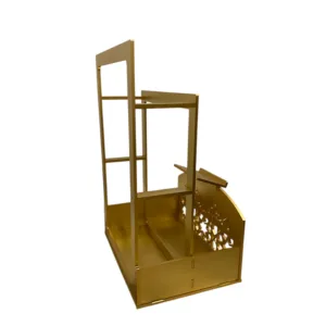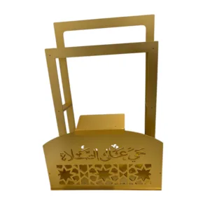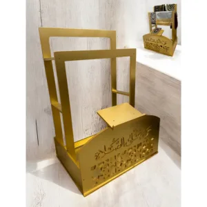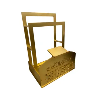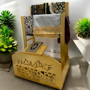 Crafted from premium wood with a luxurious gold finish, ensuring durability and a regal look. The stand’s design includes intricate Arabic calligraphy, adding a spiritual and aesthetic touch. It holds your Quran securely, providing a designated space for your prayer rug. Enhance your decor with this thoughtful piece.