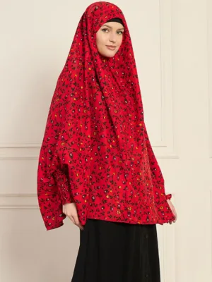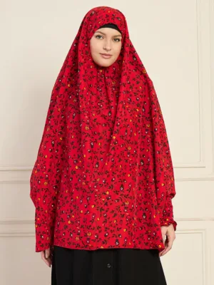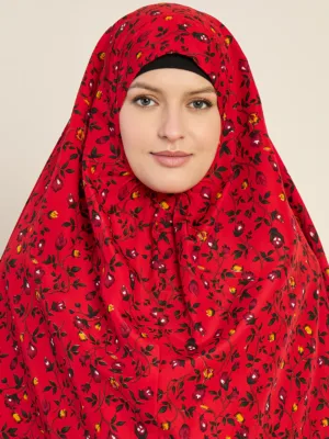 The Nabia red printed Khimar is a ready-to-wear hijab crafted for Islamic and Muslim women, combining style with convenience. Made from lightweight Crepe fabric, it features an integrated headband and ribbons for effortless adjustment, offering full head and chest coverage. Elasticated sleeves ensure a snug fit, adapting seamlessly to your face size. From the latest modest fashion collection, this Khimar is perfect for everyday wear, blending elegance, practicality, and comfort.