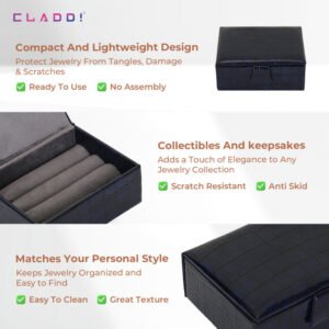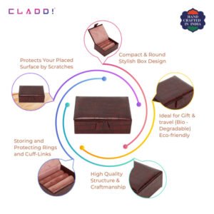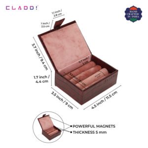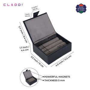 The perfect cufflink box offered by CLADD!. the ultimate presentation box wrapped in Vegan leather and lined with soft Suede to protect up to 13-15 pairs of cufflinks! Close the box and snap it for extra security.