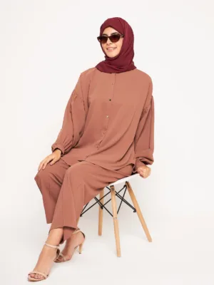 The Nabia Modest Matching Set combines a full-sleeved top with wide-leg pants, both made from premium maroon solid cy crush fabric. This ensemble strikes the perfect balance between style and modesty, offering a comfortable and fashionable option. Ideal for those embracing modest fashion, it allows for a modestly elegant and stylish look