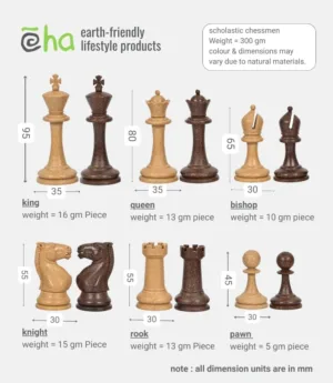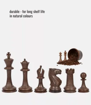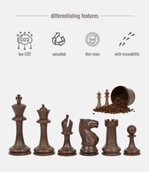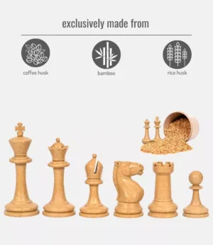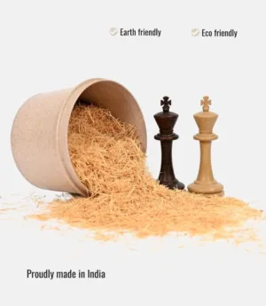 A full tournament-sized Chess set, the Turtle Scholastic Chess set features a 4.0″ King. The Chess pieces are designed as per international standards and molded with durable biocomposite material having bamboo fibers, rice husk, and coffee husk. The Chess pieces are lightweight with a simple and beautiful finish. The colors of Chessmen and pawns are inspired and derived from natural elements – bamboo for light color and coffee husk for dark color. The set features a very robust design and no delicate details to chip or break during hard usage. This is unquestionably one of the most sustainable chessmen for your use, gifting, and tournaments.
