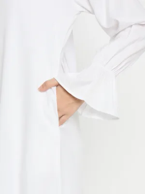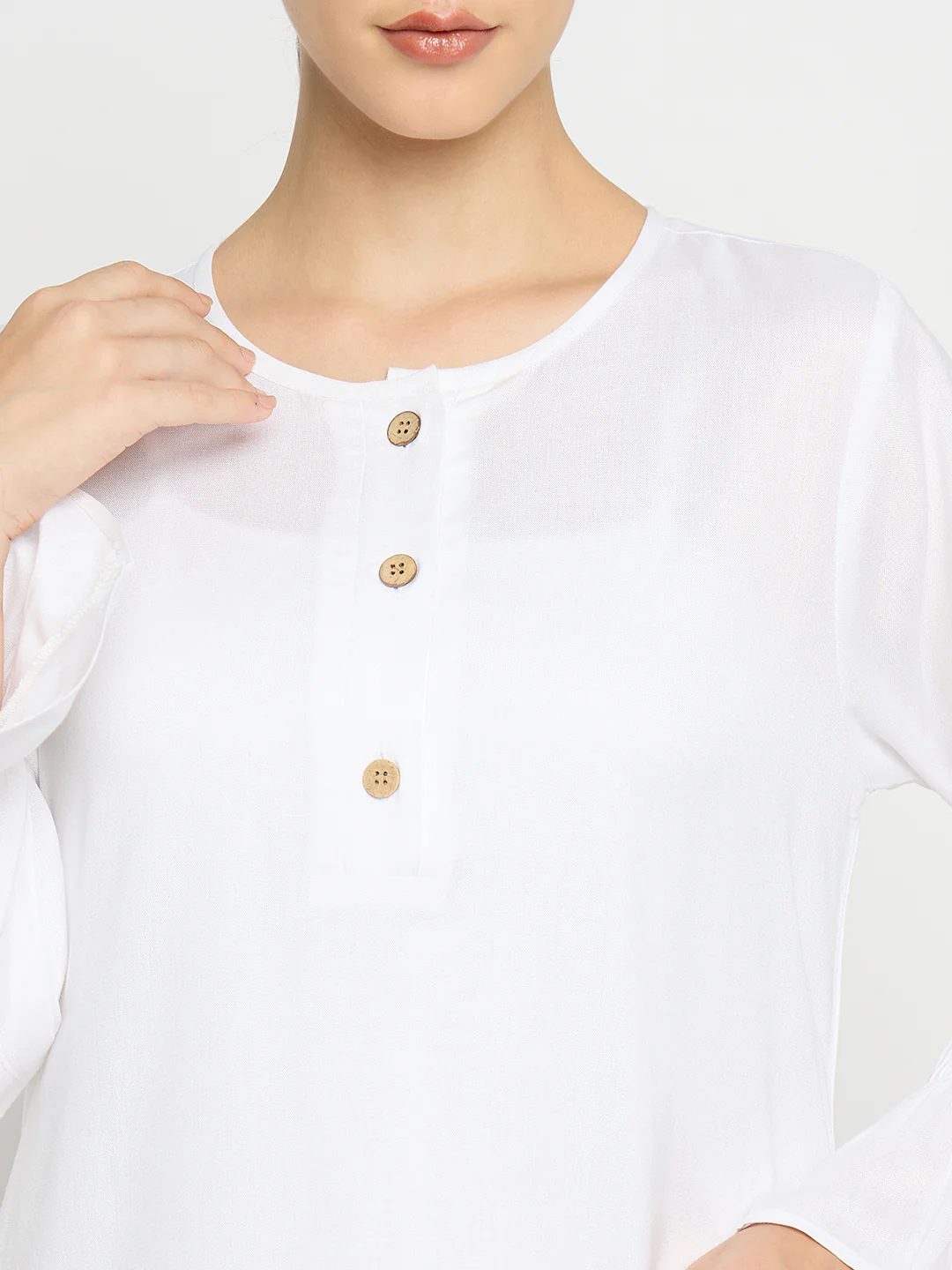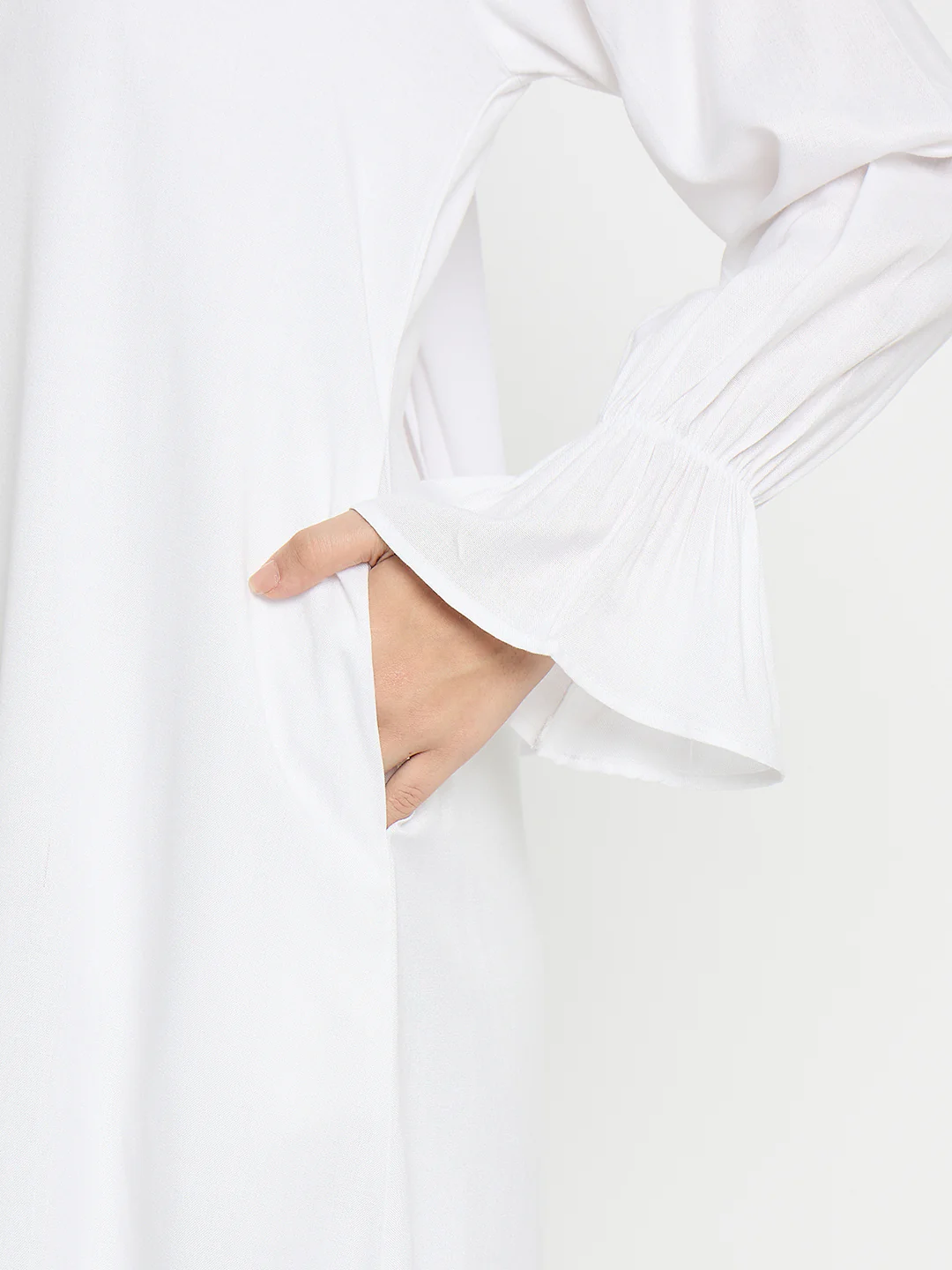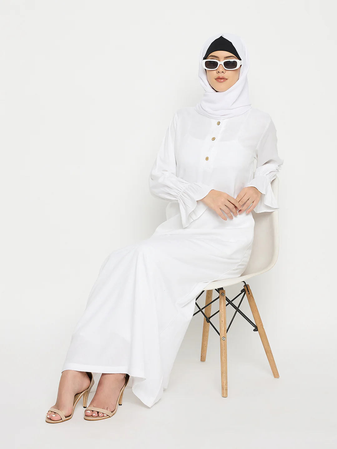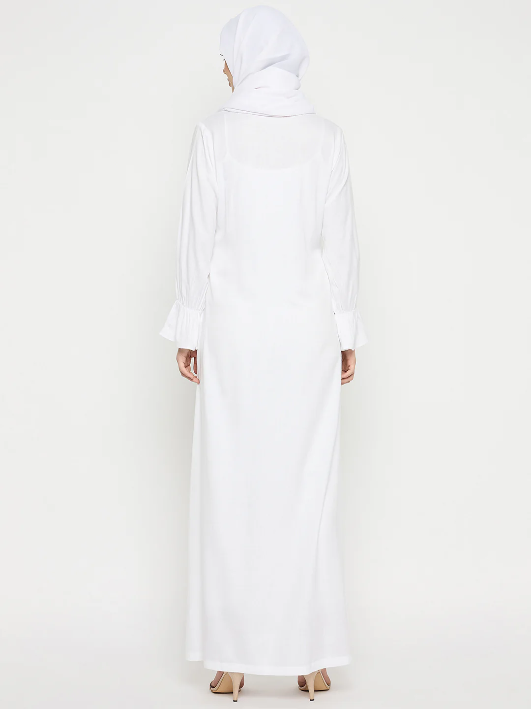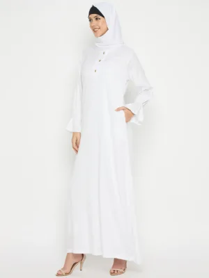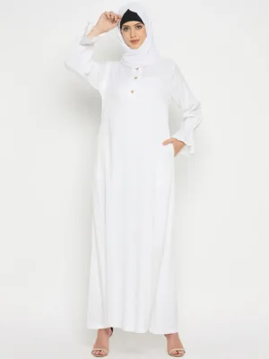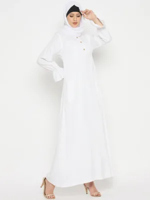 White Rayon Abaya for women embodies grace and practicality, perfect for Umrah or Hajj. With its three front button closure and two side pockets, it merges elegance with functionality. Tailored for modern Muslim women, it offers both modesty and convenience. This abaya presents a seamless blend of style and utility, ensuring a chic and comfortable experience during religious pilgrimages.