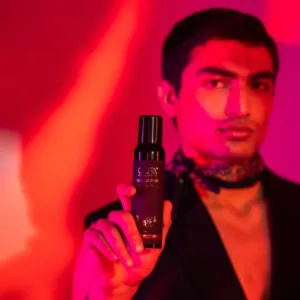 Encased in a cherry blossom embossed monochromatic bottle with hues of garnet merging into the darkness.