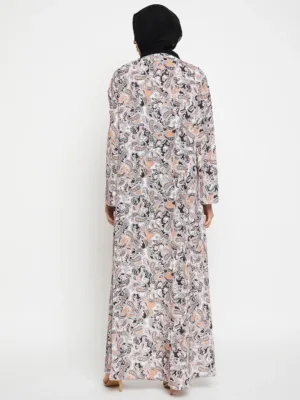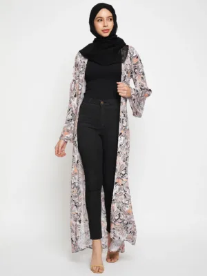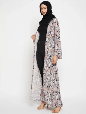 Introducing a vibrant White Printed Front Open Shrug, featuring long and free sleeves, a round neck, and a loose fit. Crafted from satin fabric, it provides a relaxed and comfortable feel, tailored for Islamic and Muslim women, adding a stylish touch to your wardrobe for various occasions.
