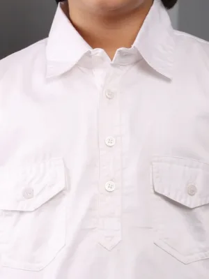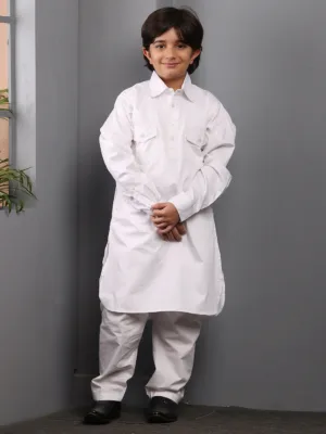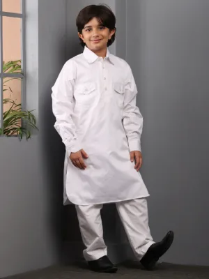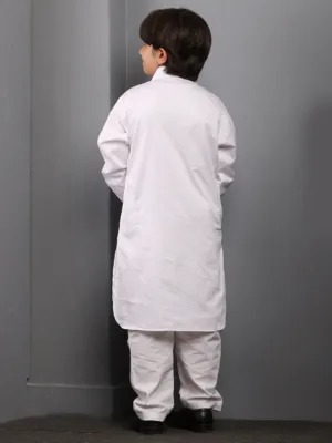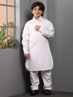 This stylish Pathani kurta pajama set for Muslim boys offers a modern yet modest look. Crafted in a solid white shade, it features a classic shirt collar for a sharp finish. Made from comfortable fabric, it ensures ease of movement, perfect for daily wear and special occasions. The latest design blends tradition with contemporary fashion, making it a must-have.