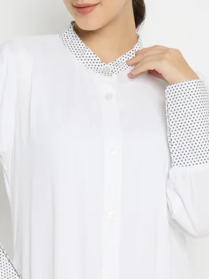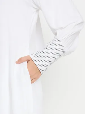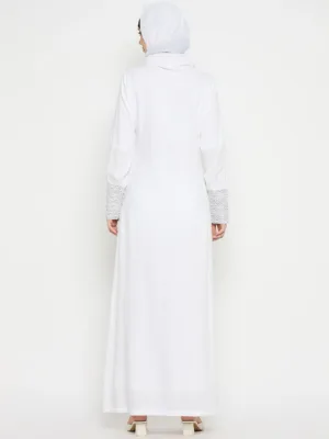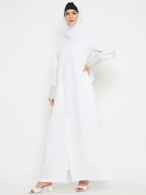Crafted in graceful rayon fabric, this White Front Open Abaya epitomizes elegance and practicality. Its mandarin collar, button closure, bell sleeves, and side pockets add a touch of sophistication. Tailored for modern Muslim women, it offers a seamless blend of style and functionality. Designed specifically for Umrah and Hajj, it ensures both modesty and convenience for the discerning wearer.